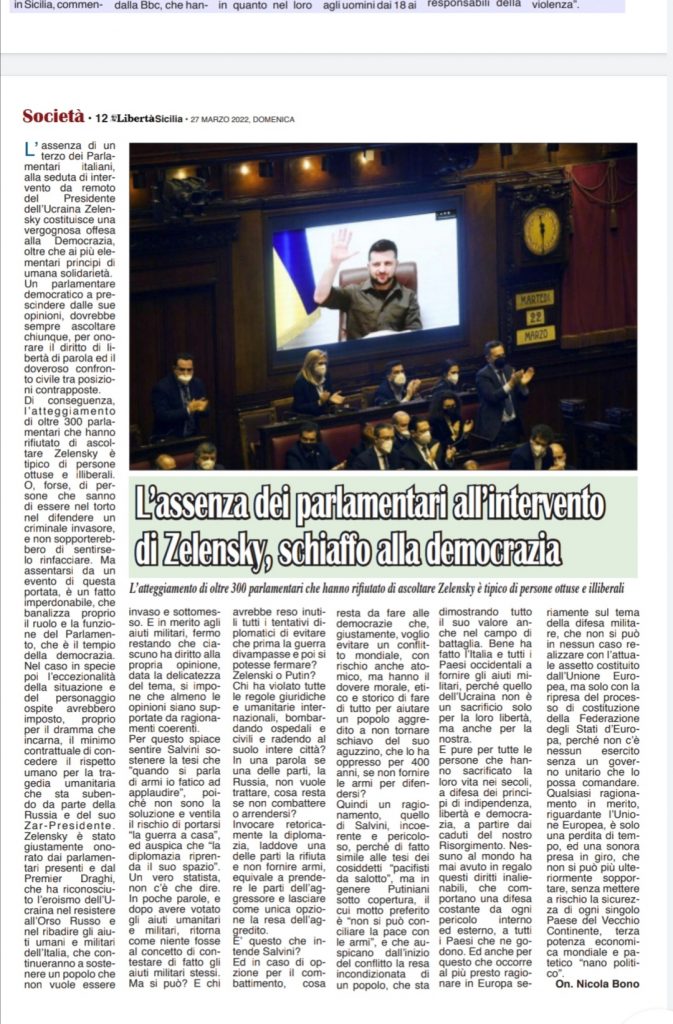 L’assenza di un terzo dei Parlamentari Italiani all’intervento del Presidente dell’Ucraina Zelensky è stato uno schiaffo alla Democrazia