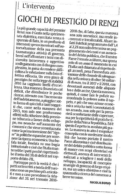 COMMENTO DELL'ON. BONO ALLA LEGGE DI STABILITA' DEL GOVERNO RENZI