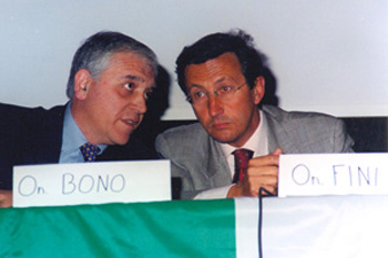 1997 - Roma, Bono con il presidente Enit Ottaviani e il presidente Fini, al II convegno nazionale sul turismo di Alleanza Nazionale